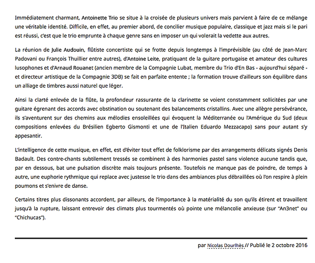 "J’ai écouté plusieurs fois le disque et je suis très séduit par l’univers créatif et l’ambiance générale. Quelques morceaux très émouvants ou à la lisière de la musique contemporaine en font un sacré moment musical où on sent une merveilleuse complicité et complémentarité.
